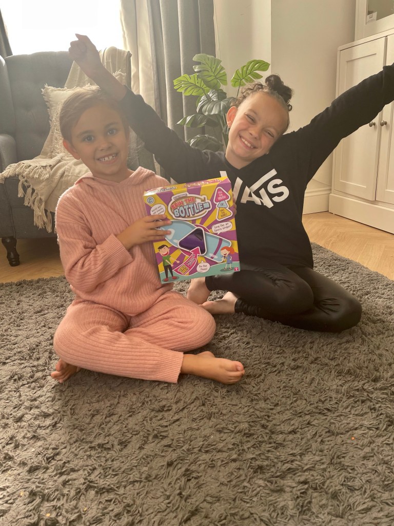 So first we played Spin the bottle, honestly it was so much fun and perfect for my girls ages so I was really pleased. It’s so easy to play, we just popped the bottle on the stand and spun! whoever the bottle lands on, the triangle lights up red for a dare and blue for a truth, one of the questions we got were to tell a secret of the person opposite you, which was hilarious because Millie told me Ella has a boyfriend and Ella said it was true ‘he is my love’ haha! and the dares were so funny, Ella had to sing happy birthday in the style of a rapper which I wish she would let me post because it was hillarious. For one of Millies dares she had to do a funny dance outside. I think it would be the perfect game for a kids sleepover to play with friends.